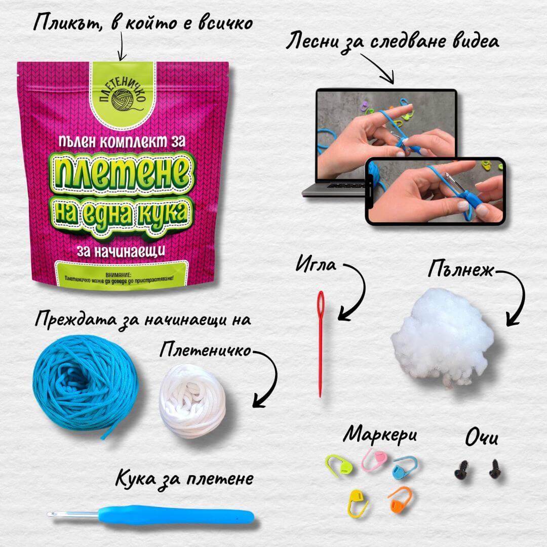 Всеки комплект съдържа всички необходими материали за направата на един Плетеничко:
